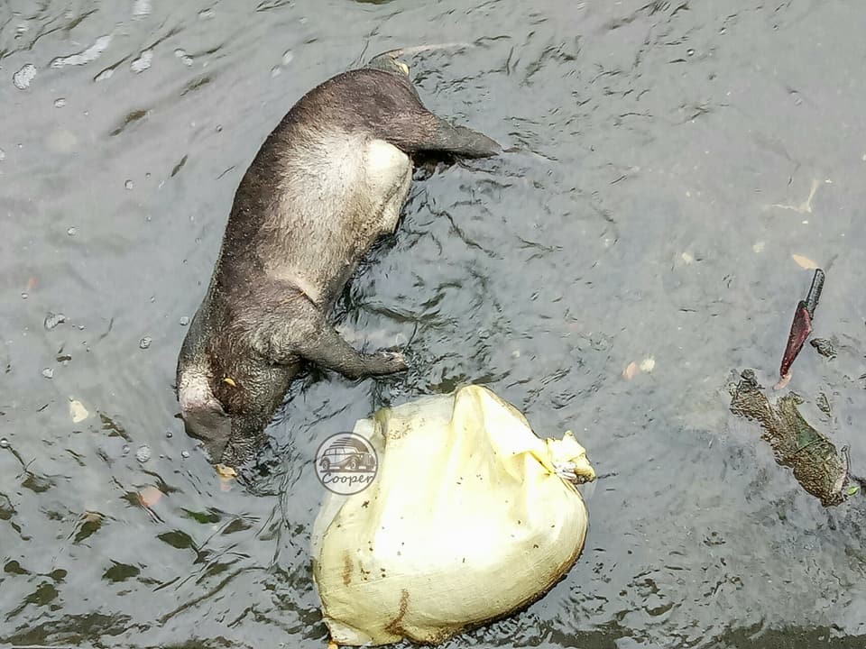 該名網友提到,當時經過該排水溝時,突然看見幾條死豬,緊接著就聞到了噁心的臭味,「猛然一瞥,原本還以為水溝裡有河馬。」當時能見的死豬,共有2隻浮在水面上,但詭異的是,經過一天之後,其中一隻小豬竟然被人用黃色袋子包了起來,另一隻大豬則仍橫躺在水面上,更值得注意的是,水面還多了一支沾有血跡的小刀。