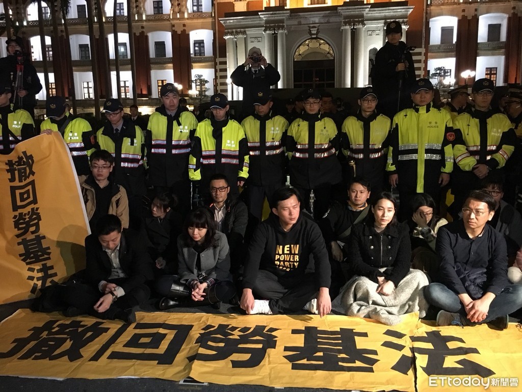 由於不滿民進黨強勢處理《勞動基準法》修正草案,時代力量趁著下午臨時會散會時,帶著鐵鍊和鎖頭反鎖議場大門;過了一個小時後,立法院秘書長林志嘉拿著油壓剪,帶著民進黨立委攻堅突破;時代力量成員看大勢已去,轉而前往凱達格蘭大道靜坐。時代力量立委黃國昌痛批,總統蔡英文向財團靠攏,選前喊週休二日,現在連七休一都要棄守。