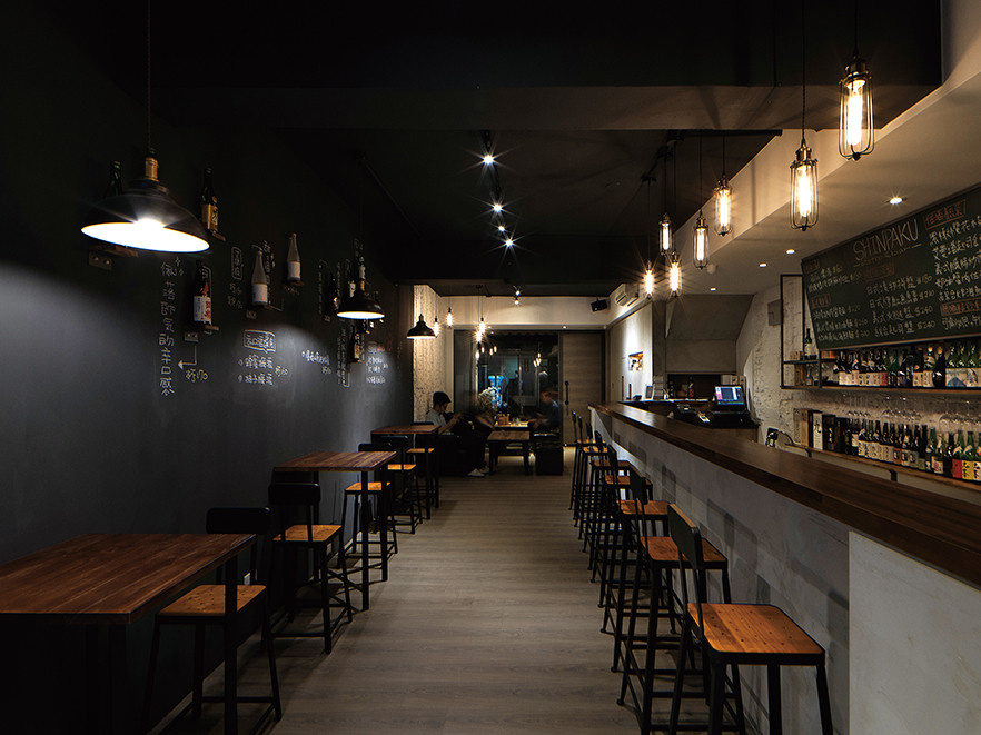 自一派簡約質樸而來,座位區背牆塗刷整面黑板漆,不僅色調完美搭配,更化身為品酒趣味。一塊塊的小木台上,安穩固定著各式清酒的空瓶Sample,搭以塗鴉式粉筆文字解說,演繹成裝飾與Menu兼具的創意牆,隨著季節、折扣、進酒種類的不同,一眼帶過的隨興或細細閱讀的樂趣,最能滿足潮世代的喜新求變。