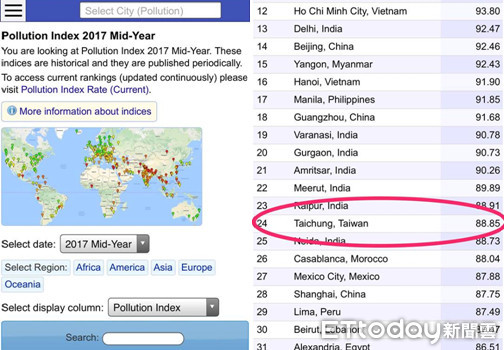 根據「全球生活成本統計網Numbeo」的排行榜,汙染最嚴重的城市為迦納首都阿克拉,而第一次進榜的台中竟一下就搶進第24名。