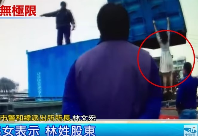當時吳姓女股東阻擋不讓人吊走她的貨櫃屋,雙方發生爭執,警方趕來協調,穿著白色連身裙裝的她發現貨櫃屋已經被吊起,連忙跑過去雙手緊抓貨櫃外的鐵桿,雖貨櫃升高幾公尺,讓周邊的民眾驚呼連連,吊車駕駛見狀,連忙把貨櫃放下來。