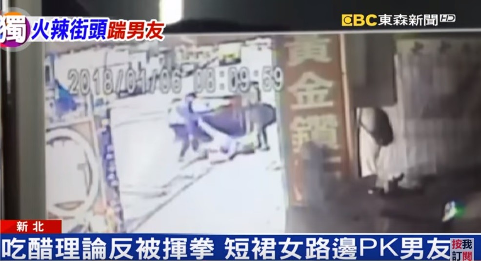 監視器畫面中,吳男開著車到新北市一處檳榔攤尋找女友,2人站在轎車後方發生激烈口角,男子一度作勢要將女友拉回車上談判,立即點燃雙方戰火。徐女不顧當時自己還穿著迷你短裙、高跟鞋,率先朝男友揮拳發難;而吳男吃痛後也不甘示弱,當場出手還擊,2人就這麼在街上打了起來,徐女被推倒在地後,還一度抬起穿著高跟鞋的腳朝男友狂踹,戰力相當猛烈。