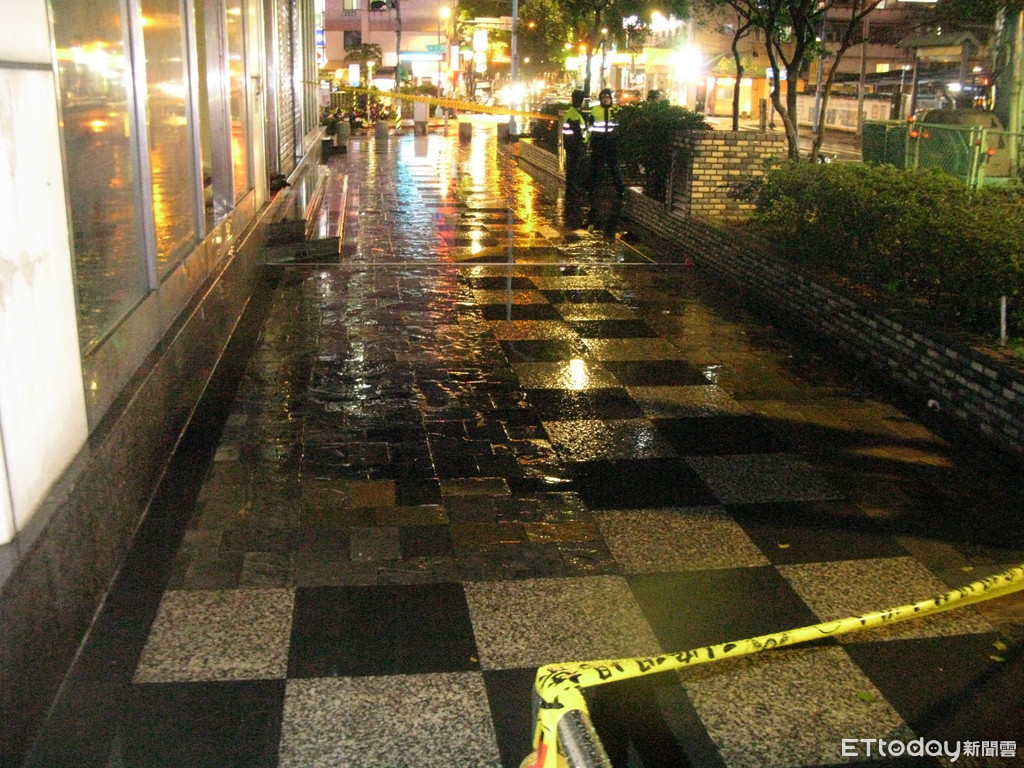 ▲婦人墜落人行道發出巨響,警方在現場拉起封鎖線。(圖/記者陳豐德翻攝)