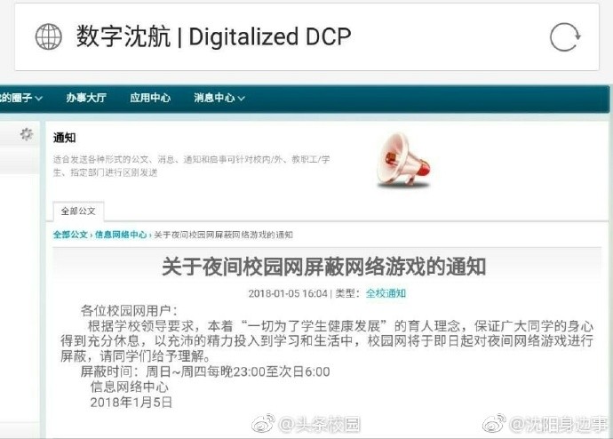 遼寧的瀋陽航空航天大學日前透過訊息網路中心,向全校學生發送了校內通知。內容指出,「本著『一切為了學生健康發展』的育人理念,保證廣大同學的身心得到充分休息,以充沛的精力投入到學習和生活中,校園網將於即日起對夜間網路遊戲進行屏蔽」,而時間為每週日到週四的晚上11點至隔天早上6點。