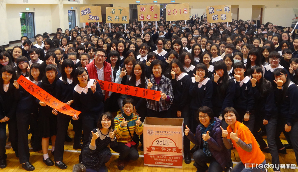 新北市三重區金陵女中全校學生,連續3年在歲末年初發起「省下飲料錢,助老過好年」愛心募集行動,這次從2017年12月25日至2018年1月5日,短短12天共有20個班級、900位師生響應,募得6萬元款項,後續在1月8日的全校朝會上,全數捐給弘道老人福利基金會,讓獨居弱勢長輩能在年節吃頓溫暖年菜、好好大掃除。