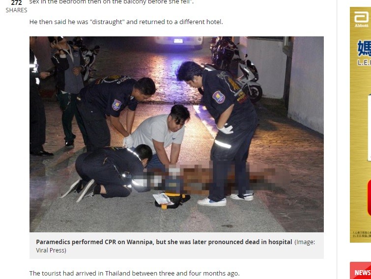 泰國芭達雅(Pattaya)一名裸女6日凌晨4時離奇墜樓死亡。調查後發現,死者是一名妓女,與英國伯明罕一名前軍人在酒店陽台進行「離奇、高難度的誇張性愛」,結果不幸從5樓墜下,最終死亡。