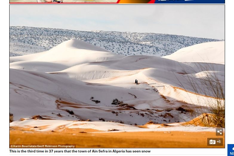 根據《每日郵報》報導,出現沙漠覆蓋白雪景色的地方,就是阿爾及利亞西北部小鎮、有「沙漠之門」之稱的艾因塞弗拉(Ain Sefra),當地時間7日上午開始降雪,在短短時間內,就讓沙漠出現一片積雪的景象,積雪達2至5公分左右,部分地區甚至積雪超過40公分。攝影師巴撤塔塔(Karim Bouchetata)表示,「當我們一起床就看到窗外再度降雪的時候,真的感到非常驚訝」,且積雪維持了一整天,直到傍晚5點才開始融化。