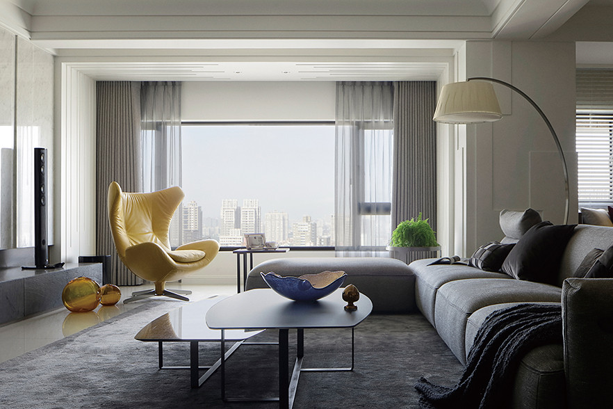 在家具的部分,客廳選用Natuzzi今年最新款的布質沙發,帶有一點現代休閒況味,硬挺的布料舒適感十足與空間完全融入;主人椅特別選擇高背圓弧單人椅,跳脫的銘黃色成為整室的視覺焦點,舒適的座感不僅美觀更是回家後休息觀景的第一選擇。