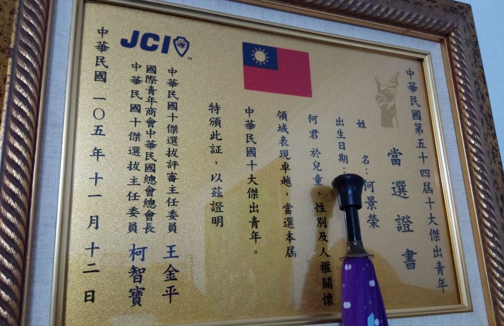 ▲何景榮在臉書上為移工發聲。圖為他的傑出青年當選證書。(圖/何景榮授權提供,請勿隨意翻拍,以免侵權,下同)