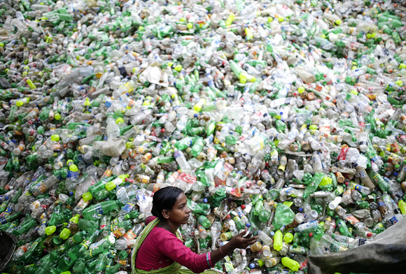 ▲在孟加拉首都達卡的一家回收工廠,一名女工在塑膠瓶堆前工作。(圖/新華社)