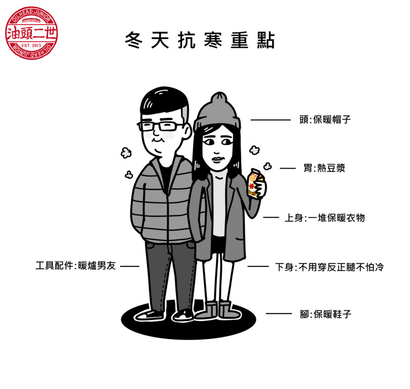 不只囂搞,常常觀察路人穿著作為靈感的知名插畫家油頭二世,精準畫風常讓粉絲舉雙手認同!近期畫出一則幽默的冬天抗寒穿搭,只見女生依偎著暖爐男友,竟可以穿短裙、短褲到處走,果然暖爐男友威力這麼大嗎?