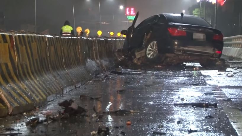 警方今天調閱路口監視器,清楚拍下BMW轎車車速頗快,上橋後不久,就撞上工地紐澤西護攔,車子輪胎還斷裂噴飛十多公尺,初步研判應是轎車自撞的意外,但確切車禍發生原因,仍待進一步調查釐清。