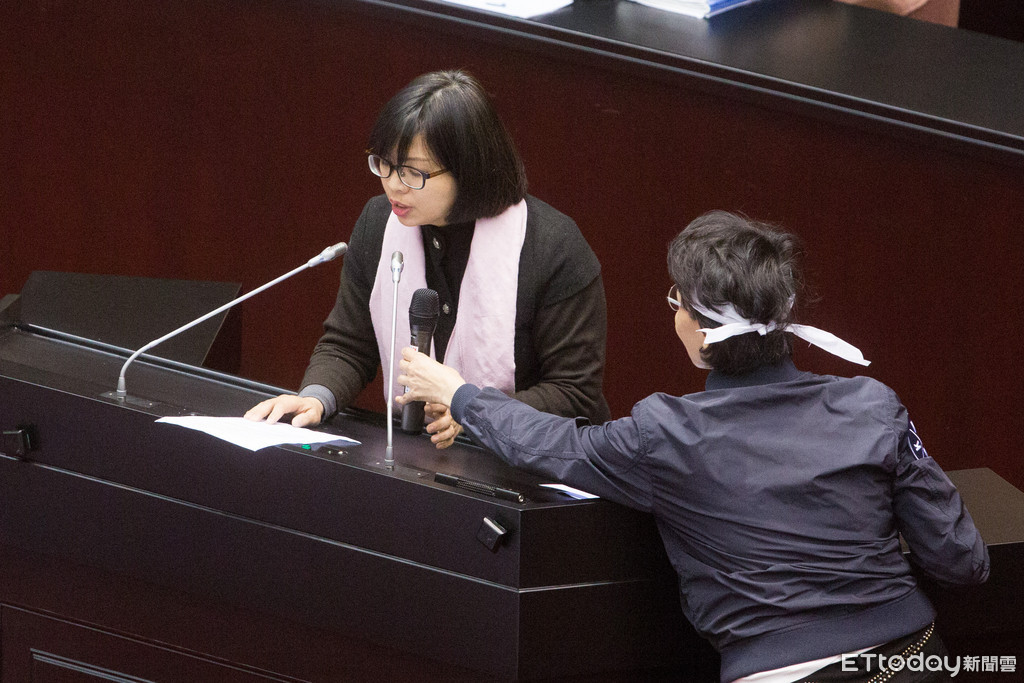 ▼綠委林淑芬上台發言,藍委黃昭順還幫遞麥克風。(圖/記者季相儒攝)