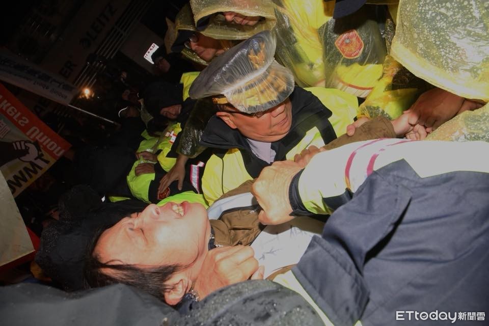 勞團一行人從青島東路出法,沿中山南路繞到距離國會議場最近的鎮江街,揚言要用怒吼讓在議場開會的立委們聽見訴求,持續高喊「拒絕過勞、退回惡法」等口號,甚至企圖衝破封鎖線,與警方再次發生激烈的推擠衝突。