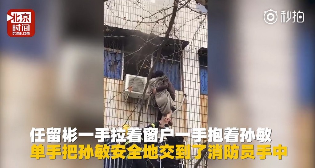 據「北京時間」報導,火災當時,懷孕8個多月的孕婦孫敏,獨自受困在3樓家中,只能站在窗邊揮舞雙手,等待救援。此時,在附近工作的電工任留彬決定奮勇爬鐵窗救人。