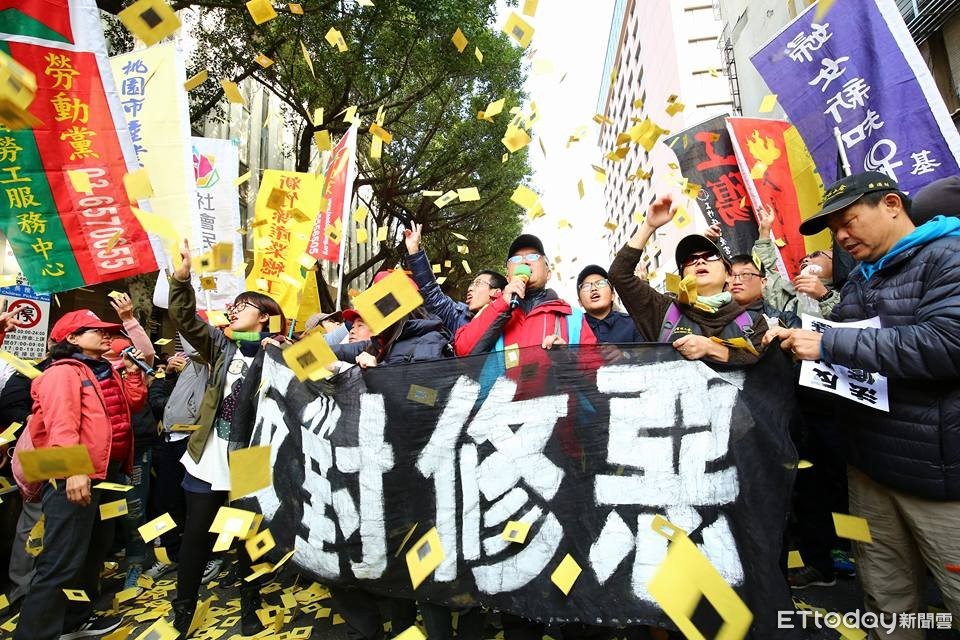 根據修法後的《勞基法》條文,7休1將鬆綁,勞工最長可連續上12天的班;單月加班上限從46小時放寬至54小時;同時,經工會或勞資會同意,輪班換班間隔可縮短成8小時。勞團隨後到行政院撒冥紙,宣示未來的行動將遍地開花,並將在今年的選舉,用選票懲罰民進黨。