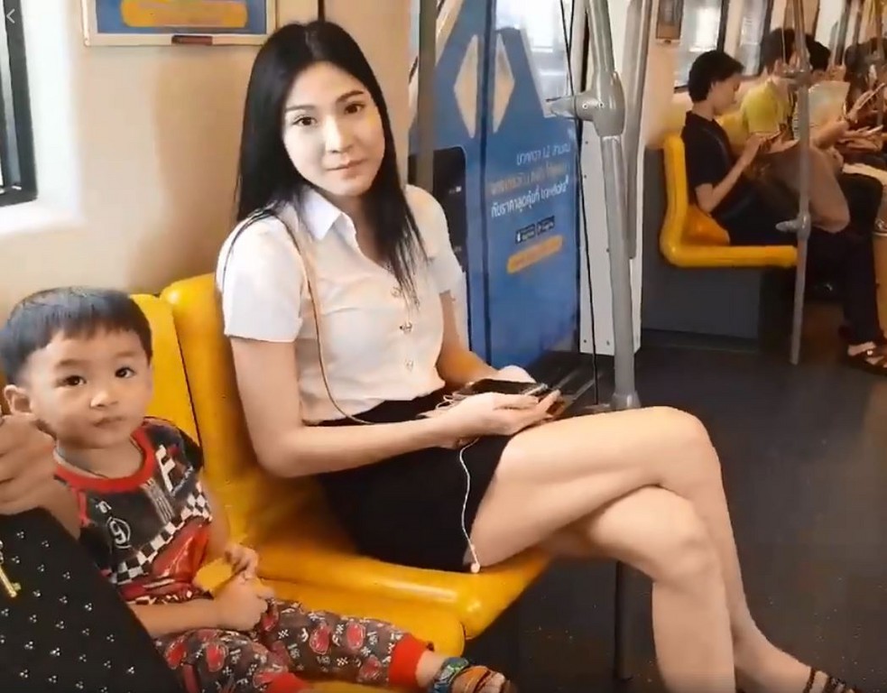 泰國一名小男童與媽媽一同搭電車時,看見隔壁座位有一名「OL襯衫妹」,他立刻化身「蠟筆小新」坐到正妹旁搭訕,還伸出小手討抱抱,就算媽媽不斷叫喊他的名字,他仍是緊黏眼前美腿正妹,還開心地跳躍奔跑,慶祝他剛萌芽的「初戀」。