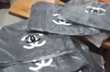 員警搜索詐騙集團的辦公室,發現裡頭的黑色貨架上擺滿了各式各樣的商品,並分門別類放好,有香奈兒的包包、精品皮件還有NIKE ADIDAS的運動褲和LV皮帶等上千件物品,然而這些通通都是假的!