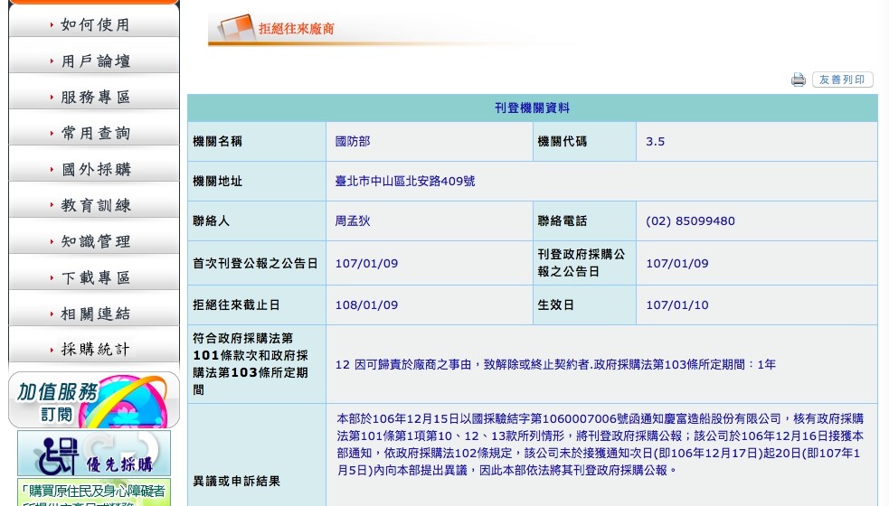 另外,工程會則在9日於政府電子採購網上公告,將慶富列為拒絕往來廠商1年,自1月10日生效。國防部也在理由欄中指出,已於106年12月15日以國採驗結字第1060007006號函通知慶富造船股份有限公司,核有政府採購法第101條第1項第10、12、13款所列情形,將刊登政府採購公報。