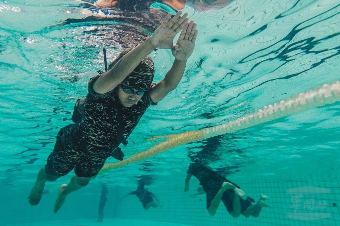 為了驗收海陸兩棲偵搜專長班146期小蝌蚪這五週以來的訓練成果,海陸兩棲偵搜專長班今日實施「徒手平潛」、「200公尺武裝游泳」測驗,因為受到寒流的影響,成功游泳池僅有14度的低溫,除了再度考驗小蝌蚪們的游泳技能,還有低溫下保持堅定的意志力。