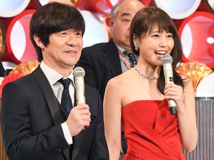 ▲有村架純主持《紅白》,低胸紅禮服成亮點。(圖/翻攝自推特)