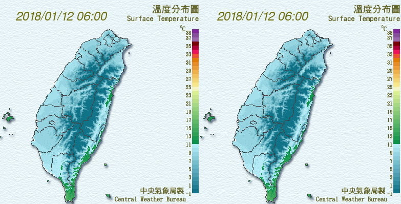氣象局表示,周六(13日)清晨寒流及輻射冷卻影響,高雄以北、東北部及花東縱谷清晨及夜晚的低溫將下探7至10度,高屏及花東也可能來到11至13度左右,這段期間除了中南部地區外,各地高溫都不超過20度,且中南部須留意日夜溫差較大;降雨方面,各地為晴到多雲、陽光露臉的乾冷天氣,只有迎風面的東半部地區及北部山區有局部降雨。