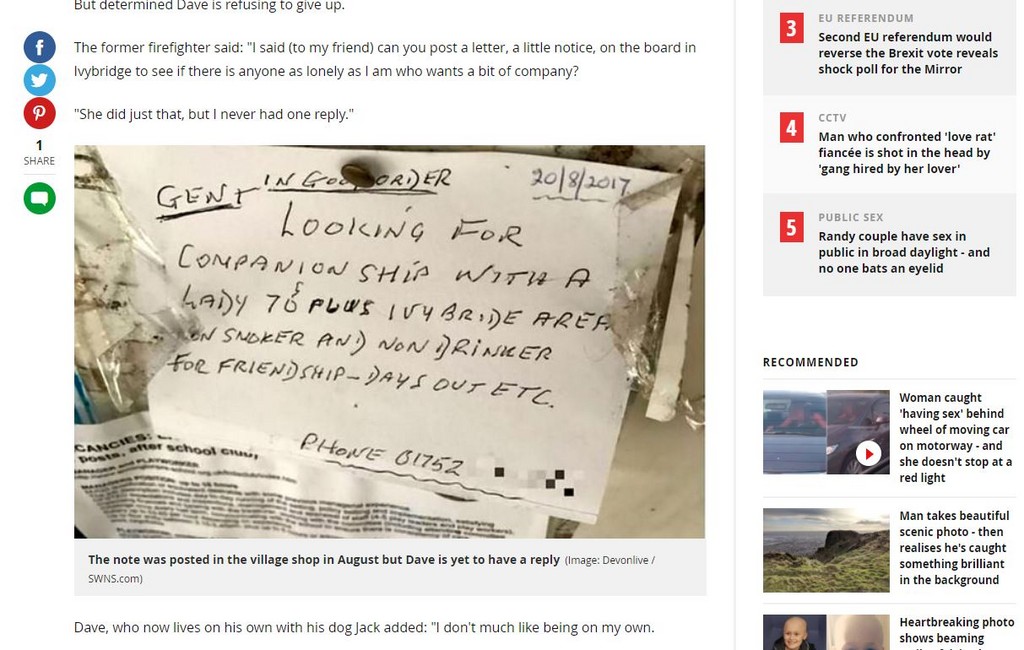 英國退休消防員戴夫(Dave Vallance)的妻子在一年前過世後,他就開始孤單一人的生活,很想要有人陪伴的他,請朋友幫忙在鎮上張貼交友廣告,希望能找到一個女性朋友來陪伴,沒想到廣告已經貼了半年,卻得不到半個回應。
