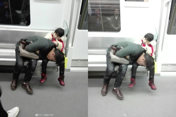 根據陸媒報導,5日下午1時許,有乘客在搭乘南昌地鐵2號線時,發現對面坐了一對父女,只見男子熟睡到倒在女兒腿上,小女孩則睜著一雙大眼睛,乖巧的摟著爸爸,還時不時拍拍他,害怕老爸睡到摔倒,奮力用小小的身軀撐住父親。