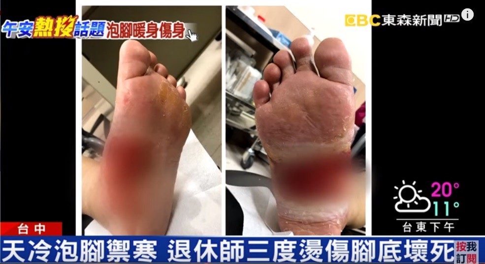寒流來襲全台極凍冷颼颼!台中市一名61歲的退休女教師,因患有糖尿病、還需要定期洗腎,於是便聽從朋友建議,在家中使用泡腳機取暖排汗,以45度高溫連續浸泡1小時,不料雙腳腳底卻被「煮熟」,整個燙傷發紅潰爛,組織幾乎壞死,連醫生見到傷口後都直呼「很罕見!」