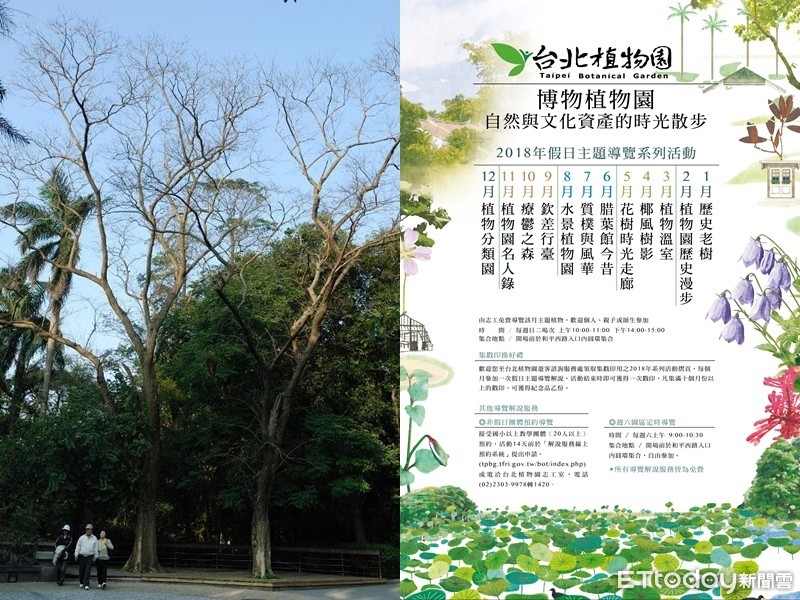 2018年的「博物植物園」系列活動,由元月份的「歷史老樹」開始,除了細數植物園老樹的故事,也觀察生活在老樹共和國上的其他生物,並透過傷病死亡的老樹,體認樹木的生命循環。二月份的主題則是「植物園歷史漫步」,將帶領民眾認識植物園考古遺址,以及從四千多年前到現代的各個地下文化層。三月份到年底的各月主題也相當精彩,依序是「植物溫室」、「椰風樹影」、「花樹時光走廊」、「腊葉館今昔」、「質樸與風華」、「水景植物園」、「欽差行臺」、「療鬱之森」、「植物園名人錄」及「植物分類園」等,透過不同的面向來探訪深具自然與文化內涵的博物植物園。