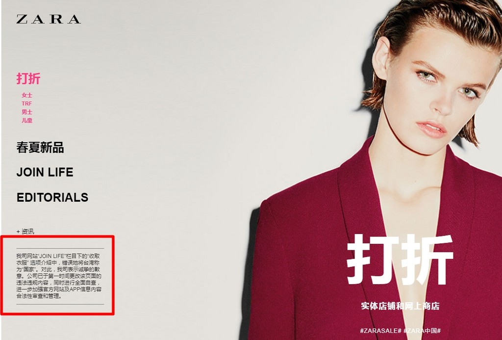 ZARA因網站把台灣標為「國家」和「中華民國」後,上海市網信辦發通知書,要求12日晚間前認錯改正。對此,ZARA在官網刊登道歉啟事,內容提及,「我司網站『JOIN LIFE』欄目下的『收取衣服』選項介紹中,錯誤地將台灣稱為『國家』。」