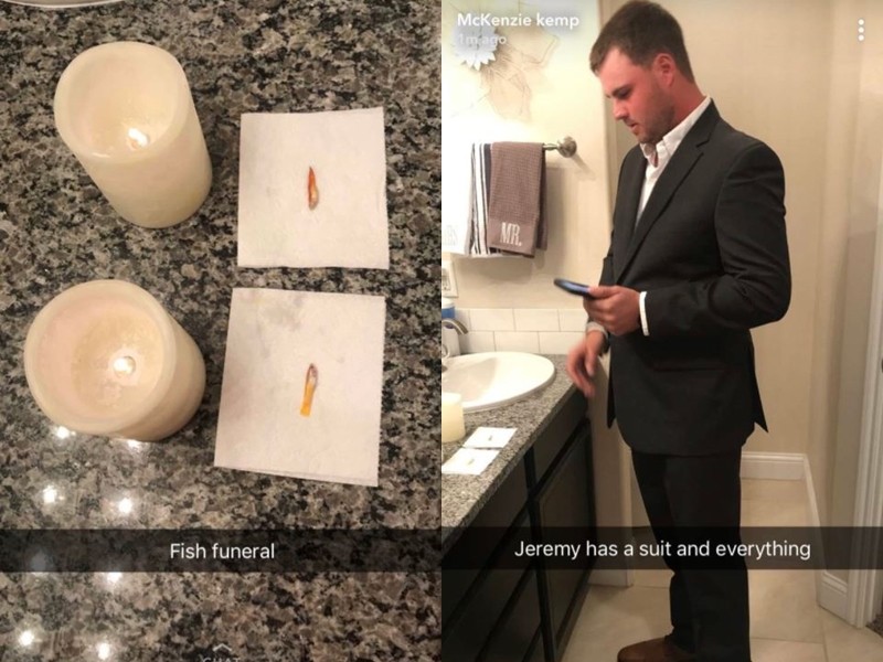 綜合外媒報導,25歲的傑若米過去是名軍人,他目前在德州理工大學(Texas Tech University)念書。他養的兩條寵物魚蒂芬妮(Tiffany)和特洛伊(Tori)日前過世了,而他為了逗太太開心,在家中為寵物進行了慎重的告別儀式。傑若米表示,「只要我有任何可以逗她笑的機會,我都會好好把握。」