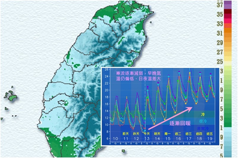 氣象局公布溫度趨勢圖,13日寒流在嘉義創下入冬最低溫4.7度,終於14日白天開始冷空氣減弱,溫度會慢慢回升,但早晚仍非常冷,日夜溫差大、呈垂直線降低,全台以「波浪型」溫差逐日回暖。預計18日有一波東北季風增強及影響,北東稍轉涼、有短暫雨,22日(下下周一)則又有一波冷空氣南下影響,各地早晚天氣轉冷,北東降雨機率升高。