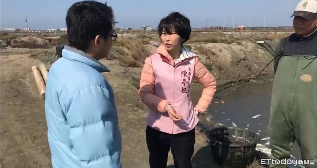 陳亭妃13日早上冒著寒風抵達七股區三股養殖漁塭,據發現,虱目魚翻白現象十分普遍,漁民為恐影響底部生態,冒著刺骨水溫進入魚塭打撈死魚,據指出,混養池內文蛤可以抗低溫約8度,但虱目魚、草蝦都不敵低溫紛紛暴斃,由於低溫持續,魚、蝦暴斃情形愈來愈嚴重,由原先不到5成,擴大到9成,損失十分慘重。
