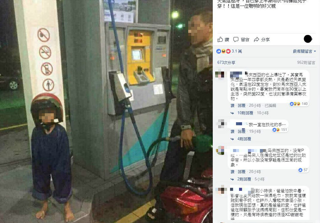 有一名網友在臉書專頁「爆笑公社」貼文表示,「天氣這麼冷 ,自己穿上半身雨衣,雨褲留給兒子穿,真是一位聰明的好父親。」照片中,一名馬來西亞的爸爸,站在機台前自助加油,不僅脖子上圍著厚圍巾,全身的防寒裝備更是齊全;旁邊則是站著年紀約只有國小的男童,頭戴安全帽呆望鏡頭,奇怪的是手臂完全消失,仔細一看才發現是身上套了大人版的「雨褲」。