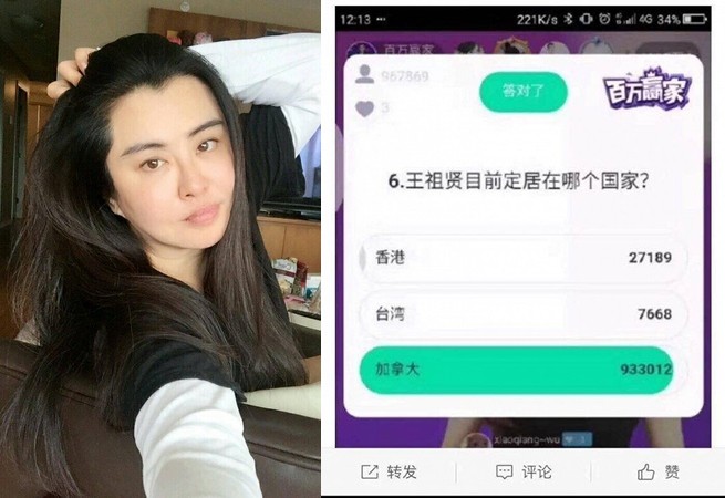 《百萬贏家》13日的直播遊戲進行到第6題,題目是「王祖賢目前定居在哪個國家?」可以選擇的答案分別有「A、香港,B、台灣,C、加拿大。」有觀眾在彈幕留言,「為甚麼台灣是國家選項?」