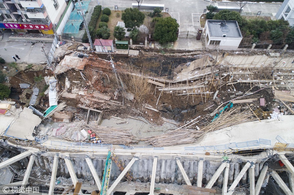 據《現代快報》報導,位於竹山路360號的建築工地,14日凌晨4時突然爆發巨大聲響,工地內建築大面積塌陷,施工機器、設備都陷入坑內,路邊的電線杆也紛紛倒落,汙水管破裂導致泥濘不斷。
