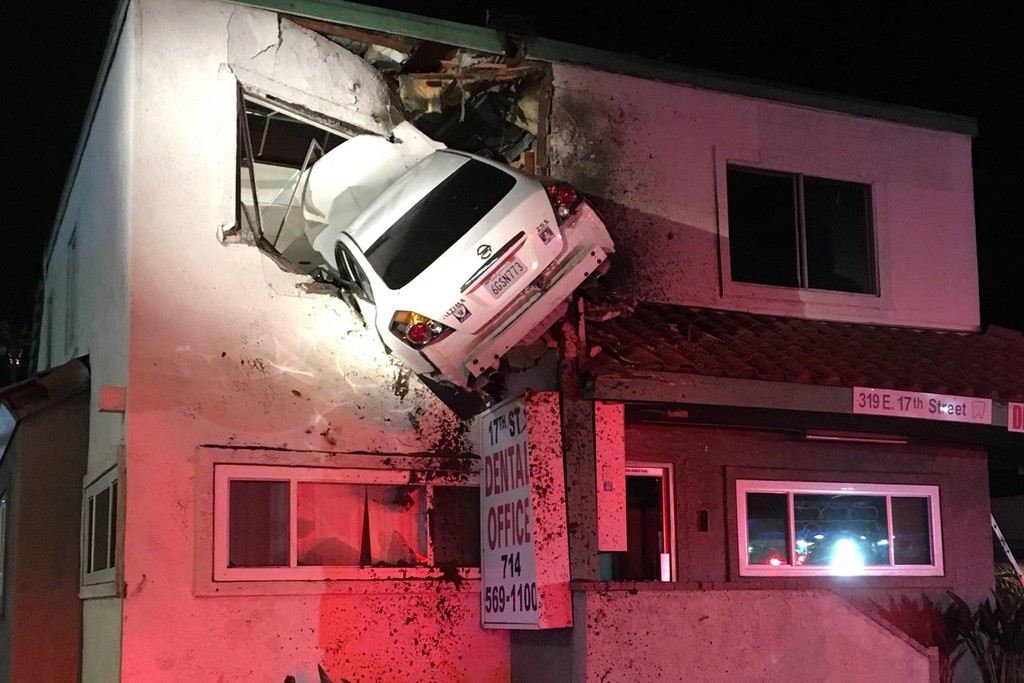 橘郡消防局(Orange County Fire Agency)表示,這輛白色的Nissan轎車在車禍發生當下,行駛速度非常非常快,接著就上撞到中間的分隔島,然後連人帶車騰空飛起,卡進路旁的牙醫診所二樓,當下車上的其中一人成功脫逃,另一個人還卡在車子裡面,,將駕駛救出之後,他坦承有吸毒,車內的兩人都僅受到輕傷,已經送往醫院治療。