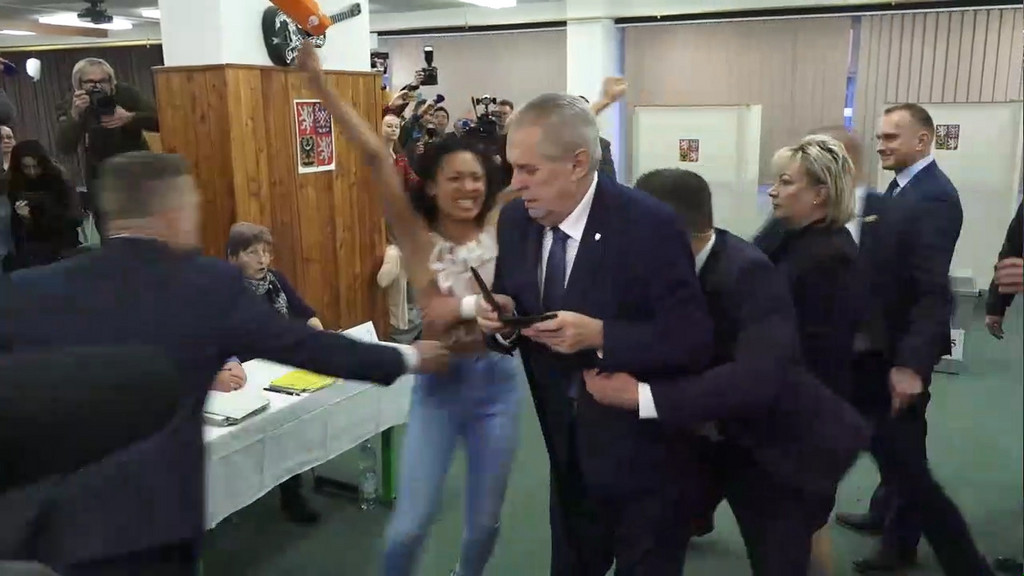 澤曼12日(當地時間)在布拉格投票時,遭到烏克蘭費曼(FEMEN)組織一名裸上身的反俄抗議人士近身辱罵,她大喊「普丁的走狗」,雖遭到警方當場壓制逮捕,但澤曼逃離現場的模樣仍引發熱議。