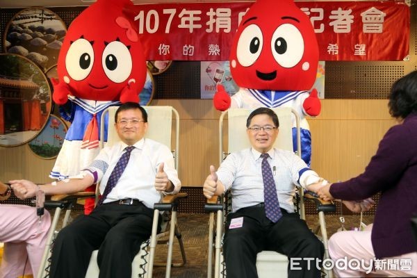 ▲台南市長李孟諺(右)及衛生局長陳怡率先響應,當場挽袖捐血,共同呼籲各界踴躍捐血做愛心,紓解農曆年前的缺血危機。(圖/市府提供)