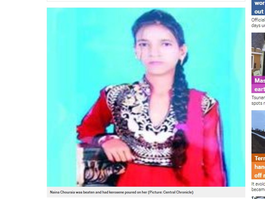 印度博帕爾14歲身障少女納依娜(Naina Choursia)只是坐在家中,卻被兩名闖入的男人暴打,並且在她身上潑了煤油,被活生生燒死,只因為21歲的哥哥狄帕(Deepak Choursia)與女友私奔,對方的家人不滿報復。