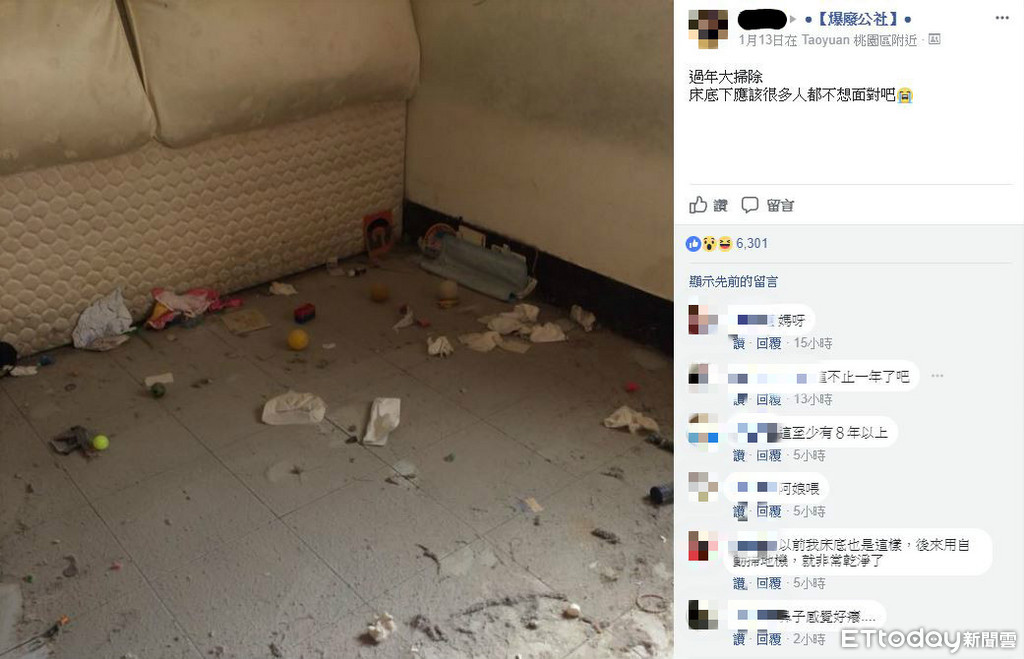 貼文一出,網友紛紛留言表示,「這些衛生紙,不簡單!」、「這床20年沒搬動過了吧?」、「我以為香灰怎麼灑在地上了。」、「灰塵都快變成沙坑了。」、「為什麼還有鮭魚卵壽司?」、「媽der,不看標題我以爲你去掃墓。」、「真好,床搬起來就到沙灘了。」