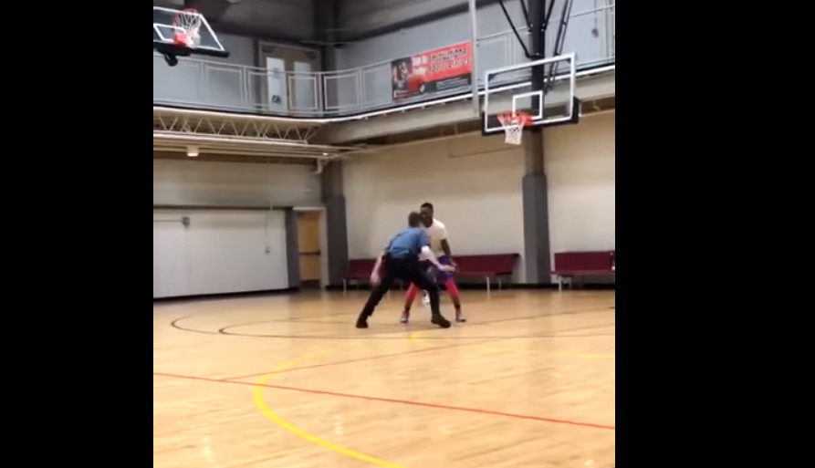影片中可以看到一名白人警察穿著制服,腳踩皮鞋在體育館裡運著球,與另一名黑人學生一對一鬥牛。他緩緩地左右換手運球,一邊防備著對手抄球的動作,接著向右側踏了一步後,將球從右手跨下運球回身體左後方,並順勢從背後向上方一拋,剛好飛過了黑人學生的頭頂但沒有被發現。