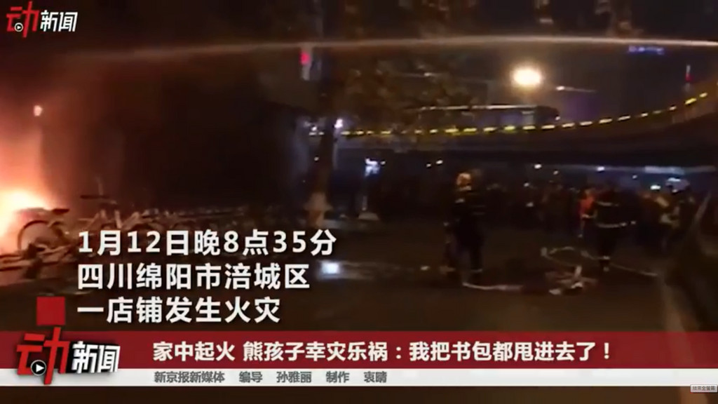 一則名為「家中燃起大火,熊孩子幸災樂禍」的影片近日在大陸網上瘋傳。據影片顯示,綿陽市涪城區12日有一間店鋪發生火災,影片中,一個小男孩用興奮的聲音說,「我們家著火了!太好了!我把書包都甩進去了!」有網友笑著表示,「可憐的孩子啊,盼星星盼月亮,終於盼到了一場大火。」