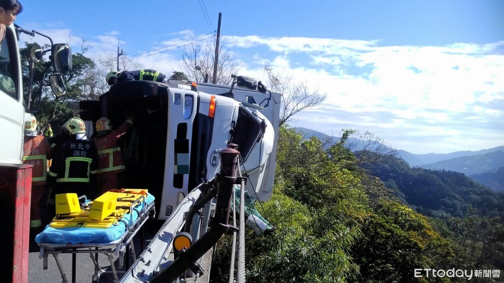 新北市新店區北宜路28.4K處今(16日)上午10時許發生大貨車翻覆意外,一名35歲大貨車李姓駕駛疑似因不熟路況,行經該路段過右彎時,不慎翻覆到對向車道,所幸當時對面並無來車,沒有造成更大傷亡。貨車翻覆後李男雙腳遭夾受困車內,同車的女友則從車窗跳出報警。