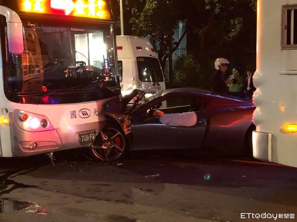 車禍發生在晚間10點多,地點在市府轉運站前松高路與市府路口。初步了解,法拉利原本沿市府路南向要左轉進松高路,車頭卻先撞上對向正停止等待紅綠燈中的國光號,再撞向後方另一輛也正停等紅綠燈的國光號,硬生生就像三明治一樣,卡在2台大車中間。