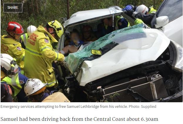 澳洲新南威爾斯州(New South Wales)17歲少年塞繆爾(Samuel Lethbridge)開車自撞,導致被困在車裡30小時出不來,受到極為嚴重的傷勢。父親湯尼(Tony Lethbridge)發揮猶如「李組長眉頭一皺」的神猜測,第六感直覺孩子出大事了,大手一揮直接租一台直升機搜查,成功把兒子救出來。