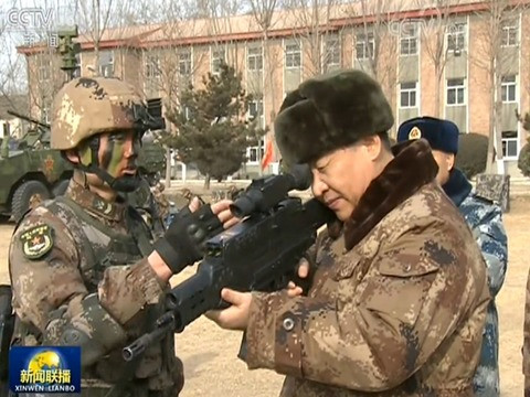 ▲習近平視察中部戰區陸軍某師,親手舉起被軍迷稱為「戰略步槍」的QTS-11單兵武器系統。(圖/翻攝自央視)