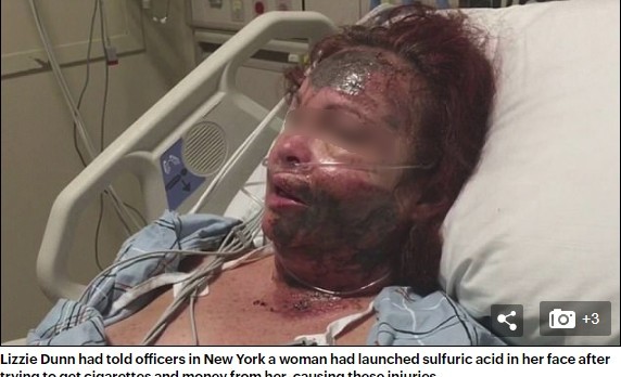據英國《太陽報》報導,鄧恩(Lizzie Dunn)透露,上周一早上獨自走在路上,碰到一名女子向她索討金錢和香菸,但遭到她拒絕,此時女子突然抓狂,抓住她的肩膀並朝臉上潑灑不明酸性物質。