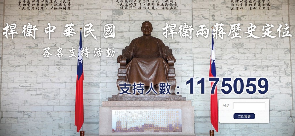 中華民國中央軍事院校校友總會12日發起了「捍衛兩蔣歷史定位」連署,網頁上寫出了兩蔣功績,並且分劃分3大主題描述,目前已有超過116萬人次簽名支持,人數也以相當快的速度持續增加。但是卻有社運人士發現,這個連署沒有設定任何限制,而且隨便簽姓名也都能成立。